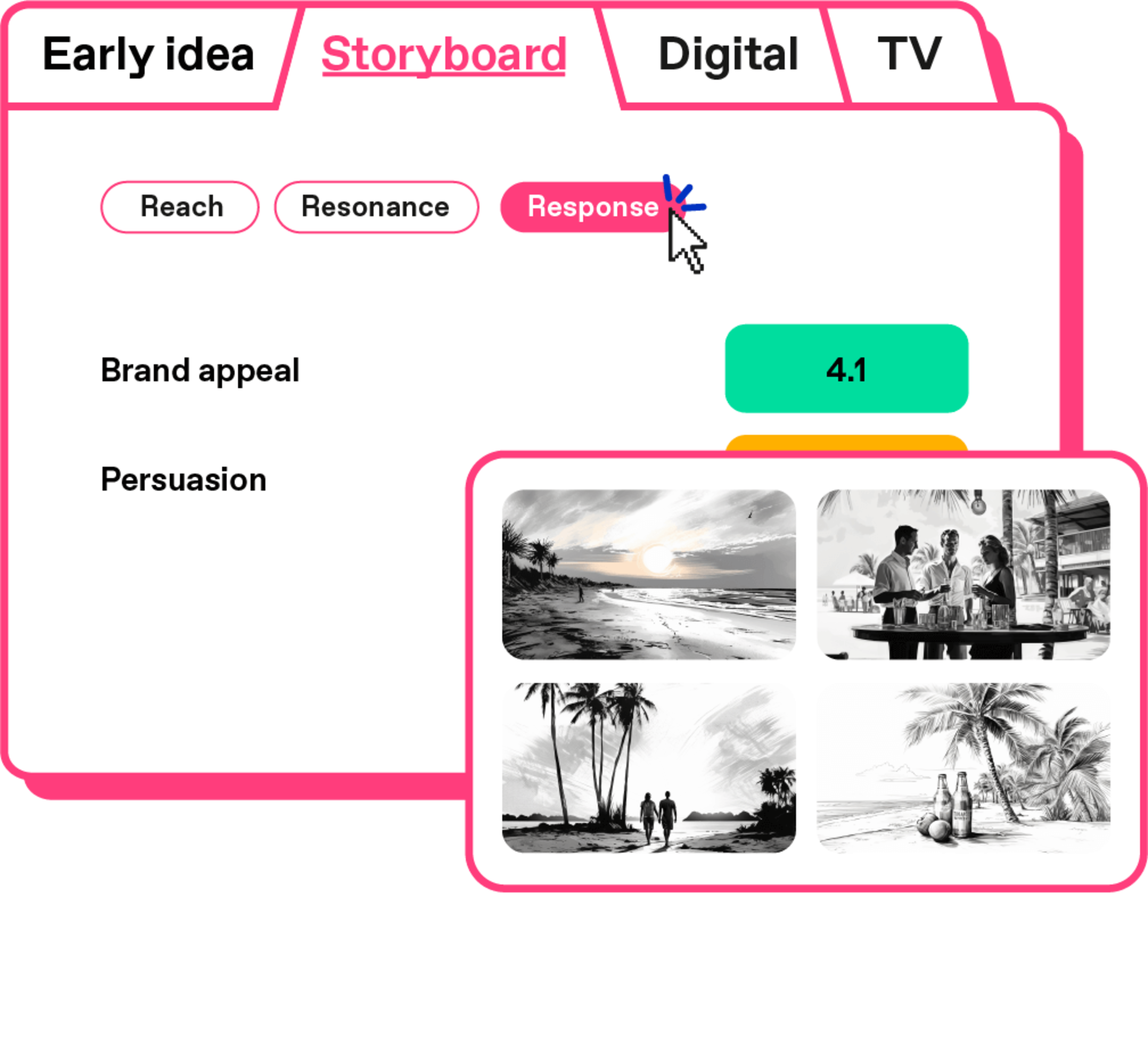 Being able to easily understand your results and move from one stage to next successfully using a consistent framework to see how your idea is developing. Optimize ideas through comprehensive metrics that assess potential for reach, resonance & response. Helps to guide and amplify creative development from idea to execution